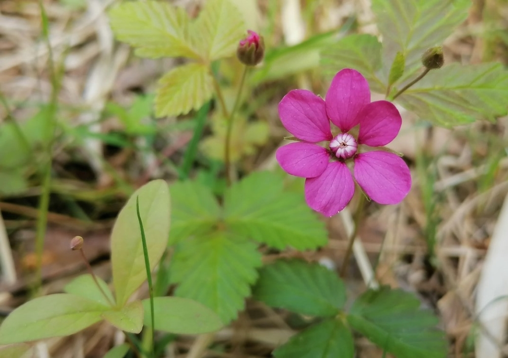The route then descended to a spot where we found a small patch of arctic bramble in bloom, glowing bright red. It’s a rare plant for me, so I crouched down for quite some time to admire the beautiful flowers. I’ve never seen arctic bramble berries, let alone tasted them.