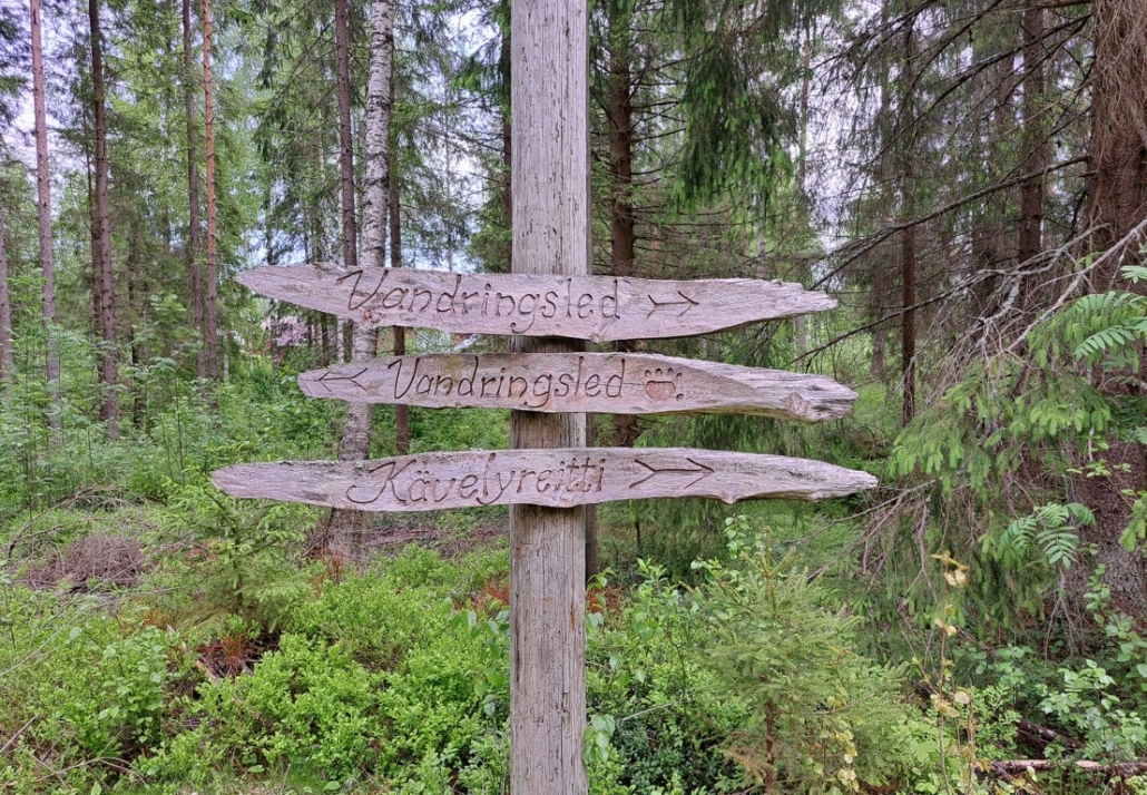 The area is said to have three hiking trails of different lengths: 1.5 km, 3 km, and 8 km. The two shorter routes are lit ski tracks in winter, making them good exercise paths for walking, and also suitable for pushchairs during the snow-free season. We decided to walk the shortest route. For a moment we wandered around the yard area until we noticed a sign tucked away in the shade of a tree: Traveller, continue on this path.