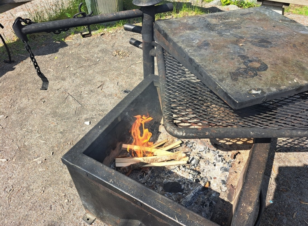 Near the observation tower, there is a campfire site. We had one piece of firewood in our backpack, and the shavings carved from it were more than enough to grill our sausages. You don’t need to carry or burn large amounts of wood to heat your outdoor meal. A small fire has the added advantage that you don’t have to wait long for embers, and the fire will be out by the time you’ve finished eating.