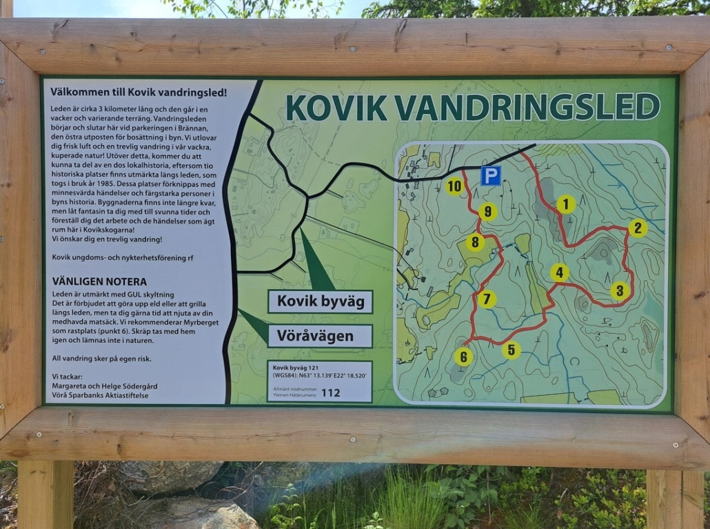 Driving along Vöyrintie road, I had noticed a roadside sign for “Kovik vandringsleden“, which I had not found on Vöyri’s website. Of course, I had to go and see it. When the village houses ended, a trail map soon appeared by the roadside (Kovik byväg 121), along with a small parking area for a few cars. This was only a couple of kilometres from our accommodation. The route has existed for 40 years, but its official opening took place this very week!