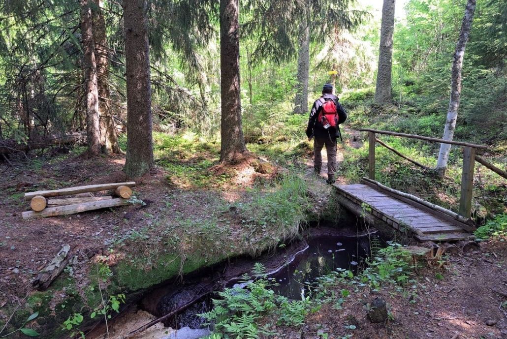 When we returned, I sat in the car eating my snack and looking at the trail map in front of me. Suddenly my eyes caught sight of a sheet of paper above the map, and I got out to check what it was. There it was—the map showing the changes to the hiking routes, and in the nearby post box, the same map in a larger format. The map revealed that some bridges had been removed from the old routes, and that was indeed noticeable… Had we seen this before heading out, we would have stayed on the marked trails. The terrain is excellent for walking, and the forests are bright, so it’s certainly a pleasure to walk the paths there.