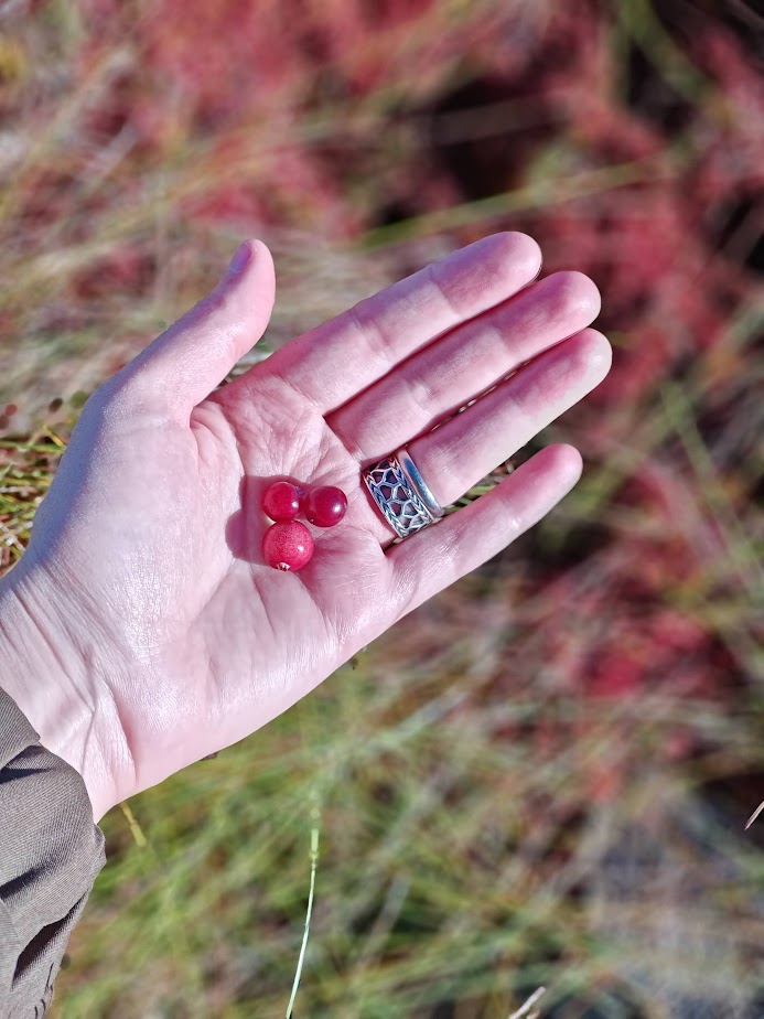 I picked a few cranberries to taste, but they weren’t quite ripe yet. Very sour, actually. I should come back later in the fall, maybe even in early winter. Finding cranberries at just the right ripeness is often a race against the first snow – if the snow arrives first, the low-growing cranberries are the first to disappear from sight.