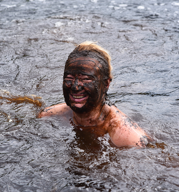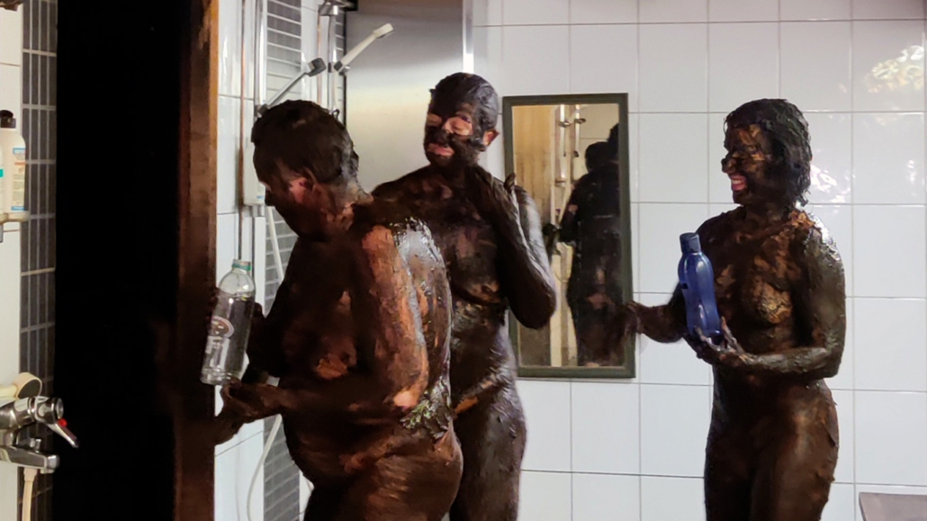 In den Waschräumen standen große Wannen mit feuchtem Torf bereit, den wir mit den Händen auf den gesamten Körper auftrugen. Man konnte ihn auch auf Gesicht und Haare auftragen, doch bei frisch gefärbtem Haar wird davon abgeraten: Der Torf nimmt Unreinheiten auf und kann die Farbe verblassen lassen. Außerdem lässt er sich nur schwer aus sehr hellem Haar entfernen. Bei hohem oder niedrigem Blutdruck wird empfohlen, den Brustbereich auszusparen. Ansonsten konnte man den Torf überall auftragen, wo man wollte. Die Anwendung fühlte sich angenehm und reinigend an.