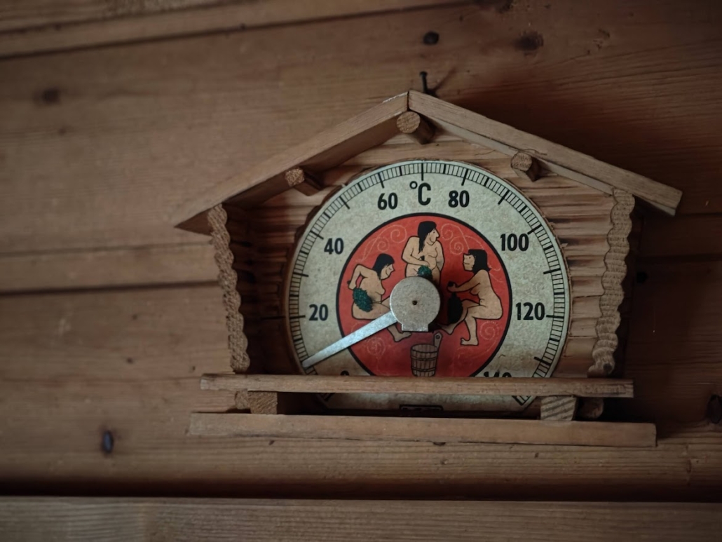 Somewhere on the wall, usually above the door or near the stove, you’ll spot a round thermometer called a löylymittari. It shows the temperature inside the sauna—just so you know how hot it really is (though most Finns go by feel rather than the exact number). A typical sauna might be anywhere from 70 to 100 degrees Celsius.