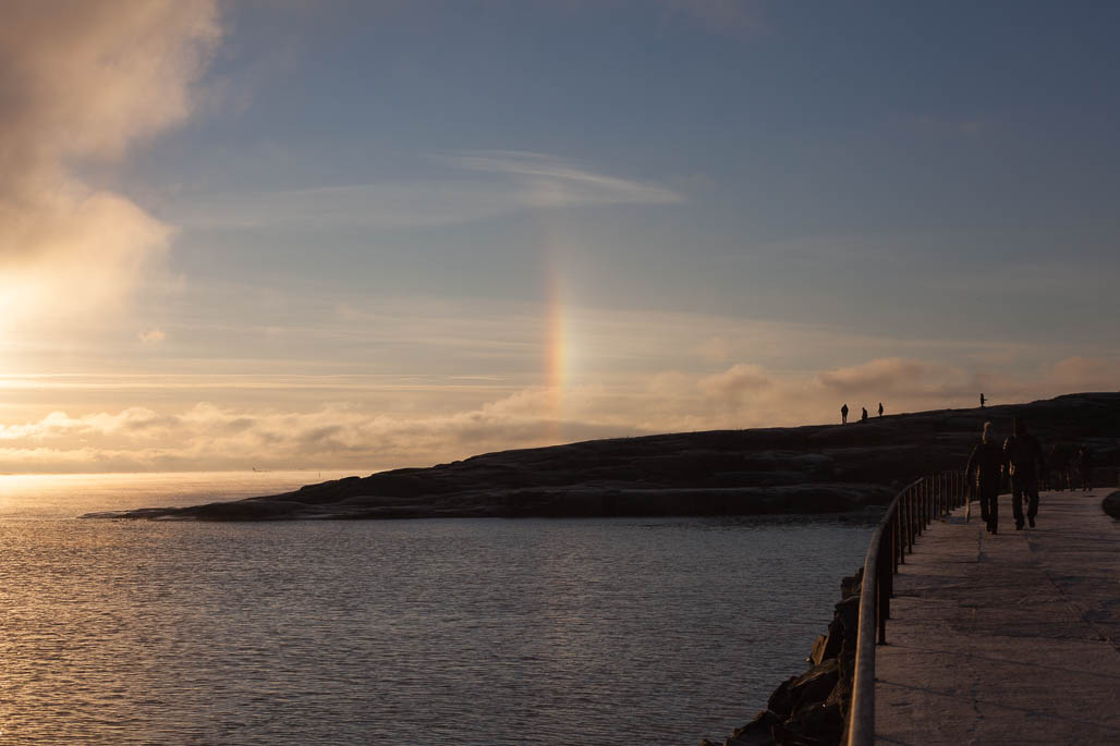 On a cold day, air above the sea is full of ice crystals and it is possible to see a special halo effect around the sun. Crystals reflect the light splitting it to the colors of rainbow.
